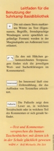 »Die Suhrkamp BasisBibliothek hat sich längst einen Namen gemacht. Als 'Arbeitstexte für Schule und Studium' präsentiert der Suhrkamp Verlag diese Zusammenarbeit mit dem Schulbuchverlag Cornelsen. Doch nicht nur prüfungsgepeinigte Proseminaristen treibt es in die Arme der vielschichtig angelegten Didaktik, mit der diese unprätentiösen Bändchen aufwarten. Auch Lehrer und Liebhaber vertrauen sich gerne den jeweiligen Kommentatoren an, zumal die Bände mit erschöpfenden Hintergrundinformationen gespickt sind.«